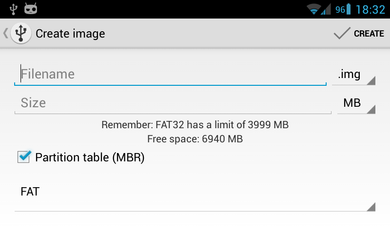 DriveDroid also includes a convenient download menu where you can download USB-images of a number of operating systems from your phone. You can also create USB-images which allows you to have a blank USB-drive where you can store files in. Blank images also allow you to use tools on your PC to burn images to the drive and create a bootable USB disk that way.